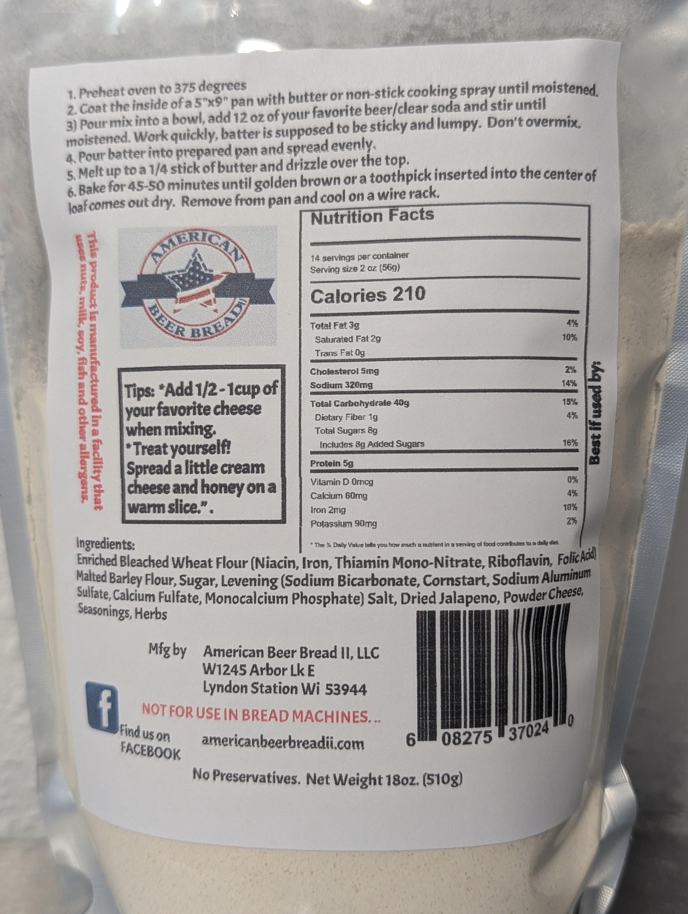 Turn up the flavor with our Jalapeño Cheese Garlic Beer Bread Mix—a bold, savory twist on classic comfort baking. Packed with zesty jalapeño (mild to medium heat), rich cheesy goodness, and a hint of garlic, this easy-to-make bread delivers bakery-quality results right from your oven. Go one step further and add your favorite cheese to the mix!